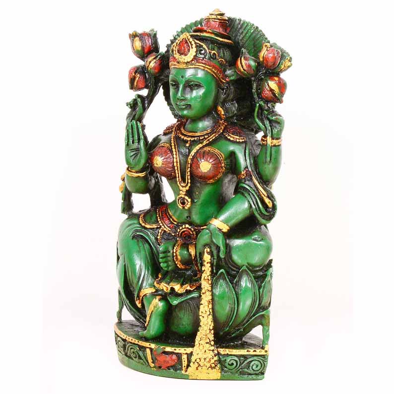 Goddess Lakshmi is the Hindu goddess of wealth, fortune and prosperity.Lakshmi has also been a goddess of abundance and fortune for Buddhists. Lord Lakshmi sitting on lotus pedestal and holds lotus in her hand, a symbolism for fortune, self-knowledge and spiritual liberation. She is the wife and active energy of the great Lord Vishnu. Her four hands represent the four goals of human life considered proper in Hindu way of life – dharma, kama, artha, and moksha. In Hindu culture, it is believed that anybody who worships Goddess Lakshmi sincerely without any greed, will be blessed with fortune and success. It is said that Lakshmi resides in places of hard work, virtue and bravery.